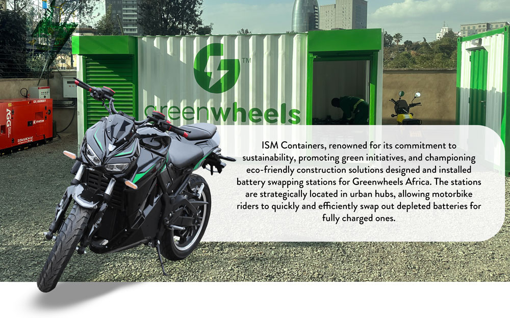 In an era where sustainability and eco-friendliness are paramount, businesses are forging innovative partnerships to drive change. One such partnership is between Greenwheels Africa, the proud owners of electric motorbikes with an impressive 80-kilometer range, and ISM Containers, a leader in shipping container conversion and modular building constructions. Together, we worked hand in hand to promote green transportation and revolutionize the way electric motorbikes are powered.