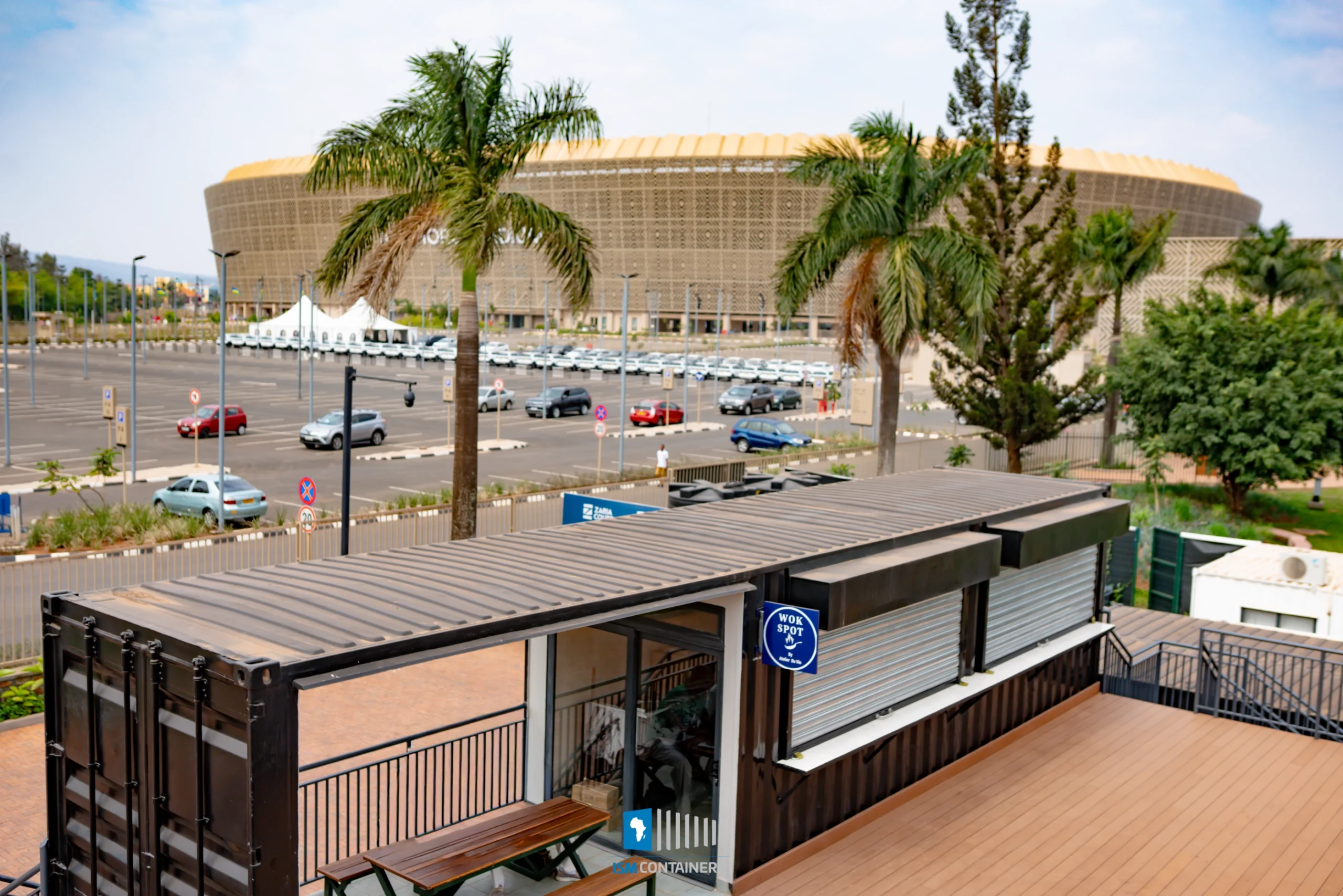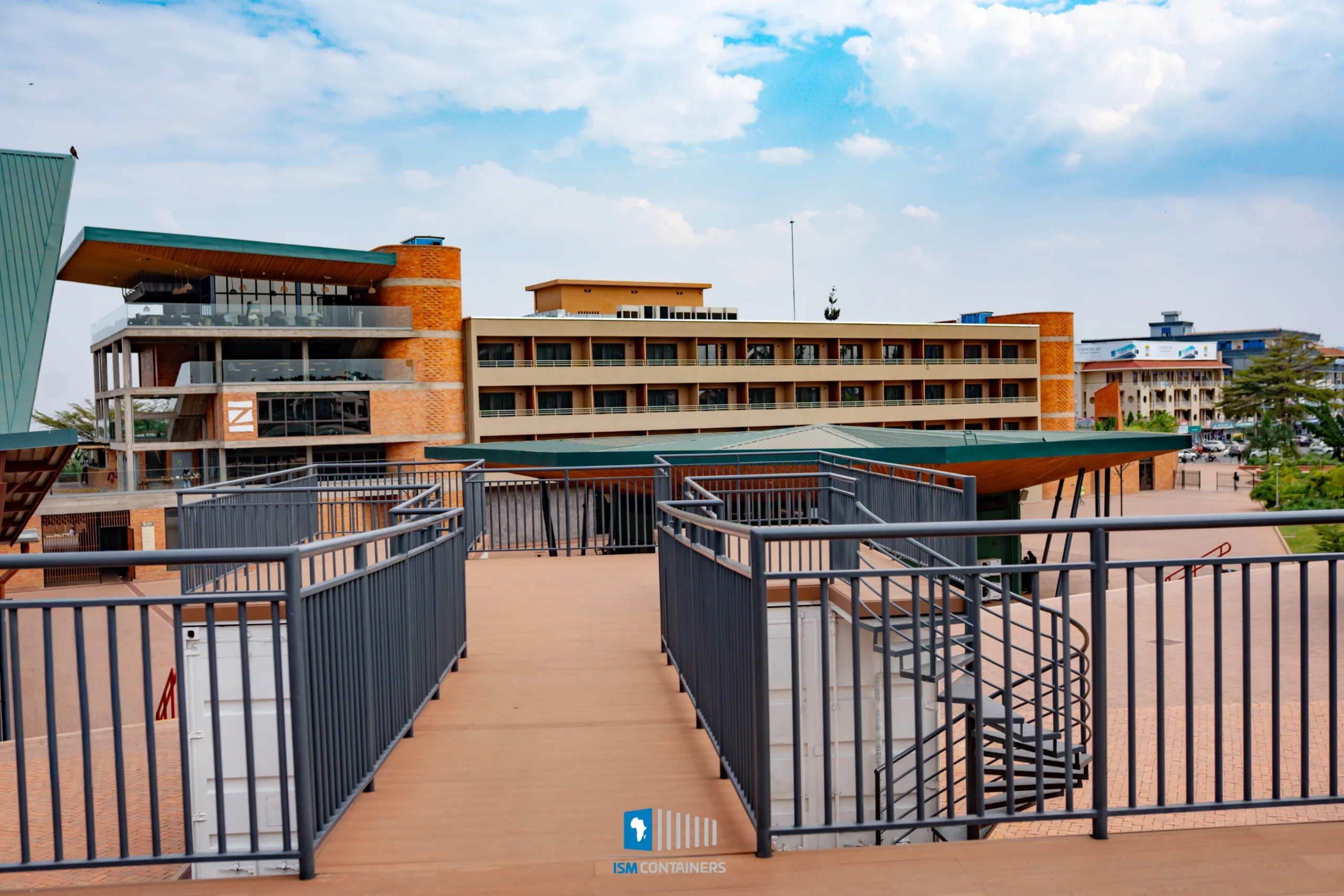 Each of the 35 container units was fabricated at ISM Containers’ facility in Nairobi, Kenya. The containers were then transported overland to Kigali, where they were swiftly assembled into a striking, multi-level structure.